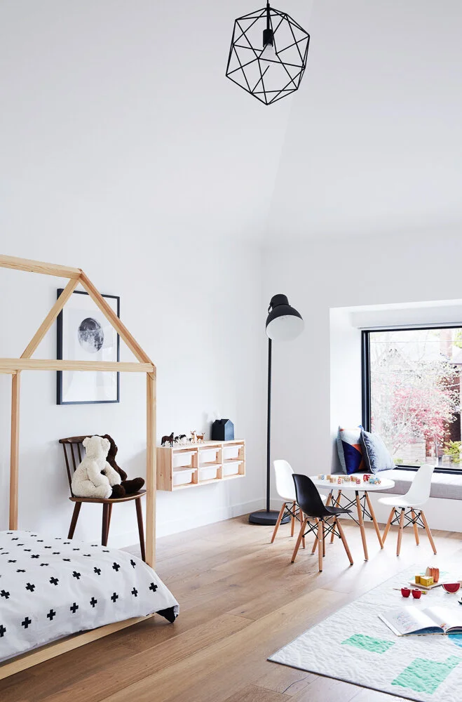 Inside, the dining room is at the centre of the open plan, divided from the living room by a double-sided wood-burning fireplace. Natural light makes its way down to the table through two large skylights and a void adjacent to the stair. The skylights are operable to draw hot air up and out of the house during the summer. On the second floor, the pitched roof is used to its full advantage with cathedral ceilings in the bedrooms and hall. Pop-out windows in the children’s rooms at the front of the house focus the view to the street and provide a nook for reading and play.